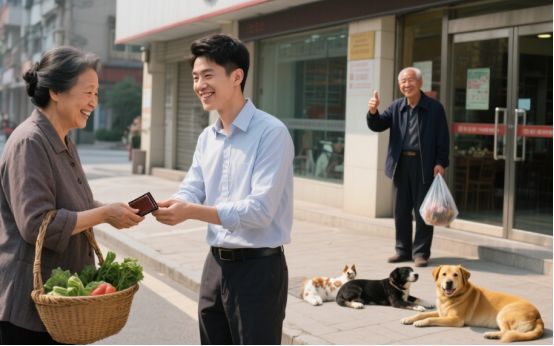 小亮摆了摆手,说没事。转身准备走的时候,他无意间一抬头,看见马路对面的老张,正从饭馆里走出来倒垃圾。