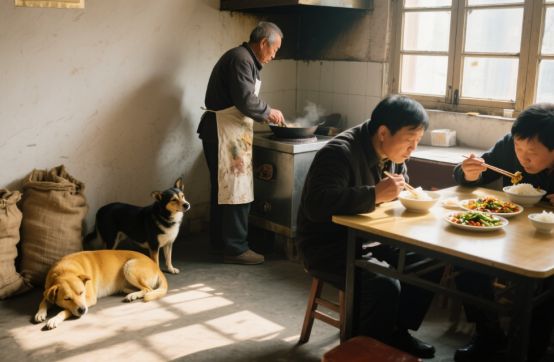 谁知道,第二天一早,那黄狗不仅没走,身边还多了两只更小的,一只纯黑,一只带花的,三只狗崽子就挤在饭馆屋檐下,把这儿当家了。